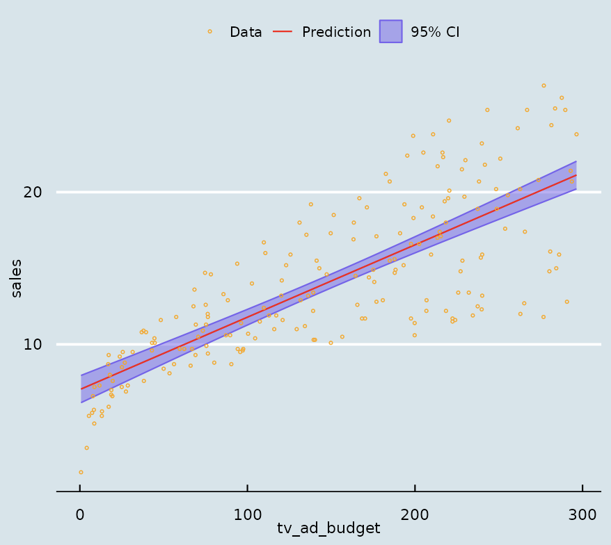 The raw data is plotted in orange and the regression line is shown in red, shaded in purple is how certain we are about our estimate of the line. The data tells us that sales income increases with TV advertising spending.